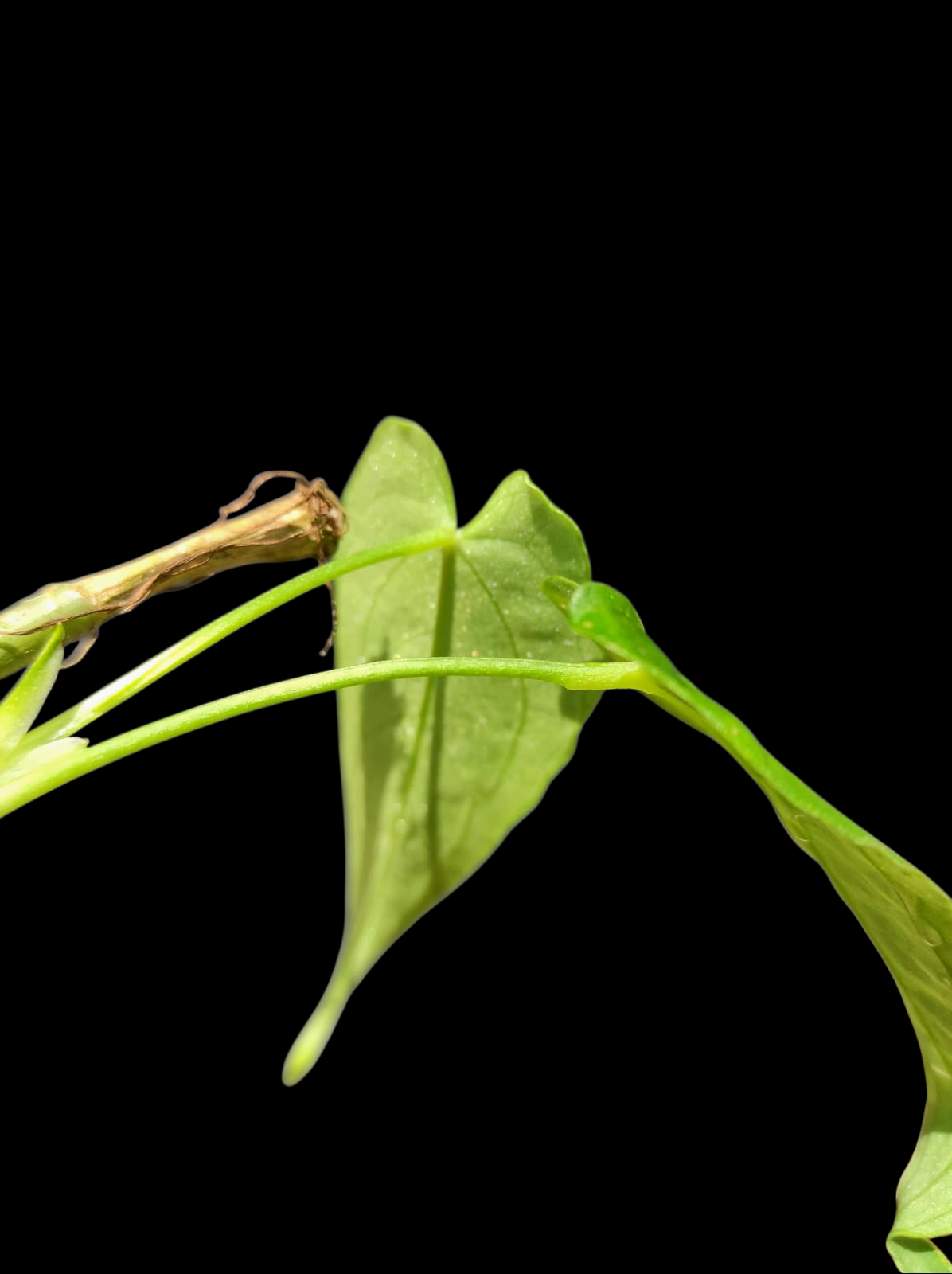 Anthurium sp. ‘Esmeralda’ is a refined juvenile Anthurium distinguished by its narrow, elongated foliage and elegant Amazonian character. This plant displays lanceolate to sagittate leaves with a pronounced acuminate tip and a subtly developing basal sinus, typical of early-stage Anthurium from the Peruvian Amazon. The leaf blades are thin to subcoriaceous, with a smooth surface and a soft satin sheen. Its fresh emerald-green coloration reflects active juvenile growth and excellent plant health. The central midrib is clearly visible, while secondary venation remains delicate at this stage, gradually becoming more defined as the plant matures. Slender, cylindrical green petioles emerge from short internodes, giving the plant a compact growth habit. Partially persistent cataphylls and incipient adventitious roots are visible at the nodes, indicating strong vitality and adaptability to well-aerated substrates.